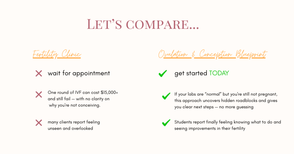 The Ovulation to Conception Blueprint focuses on real root causes of fertility struggles- not just surface fixes. You’ll rebuild the foundation your body needs to ovulate, implant, and sustain a healthy pregnancy by: